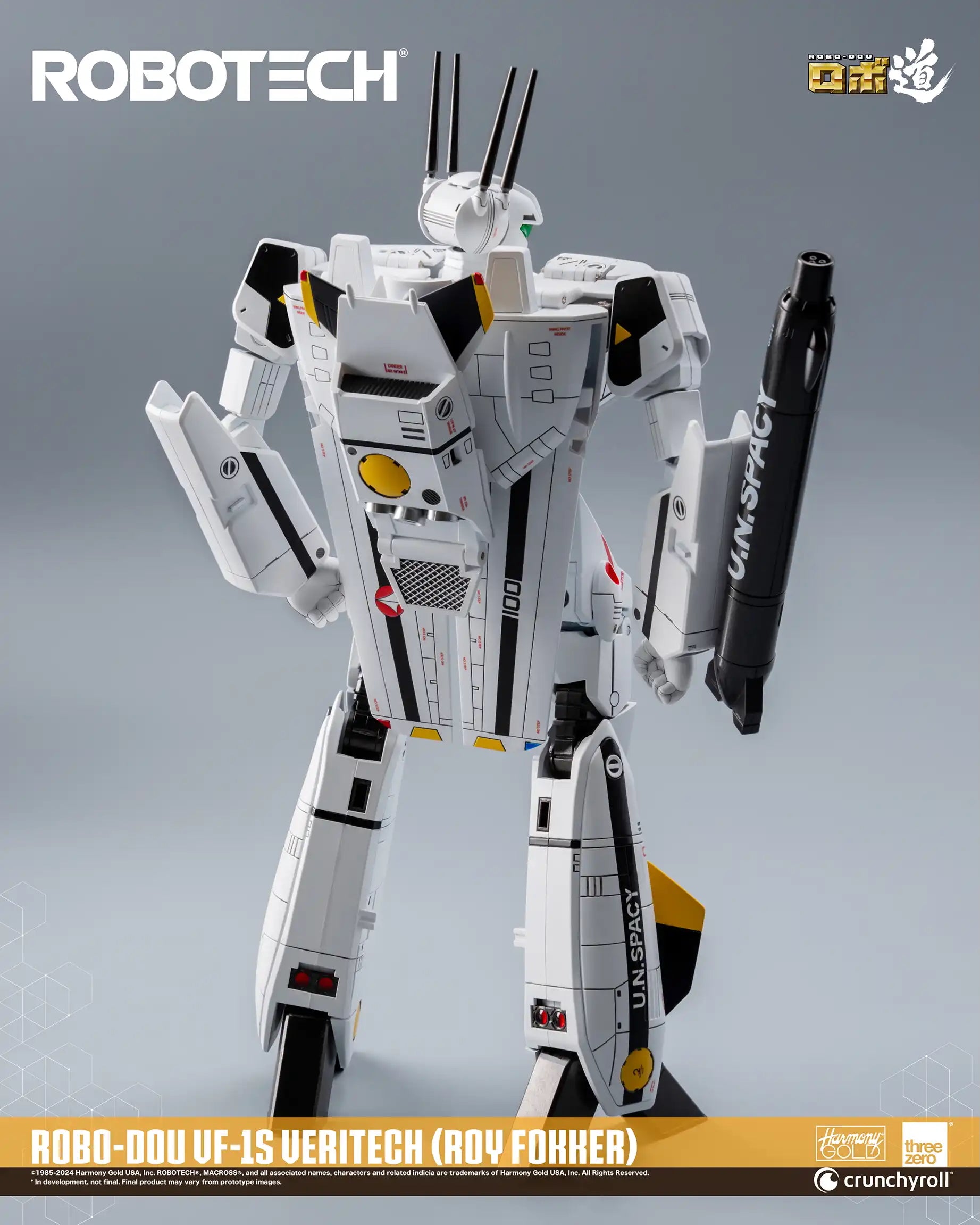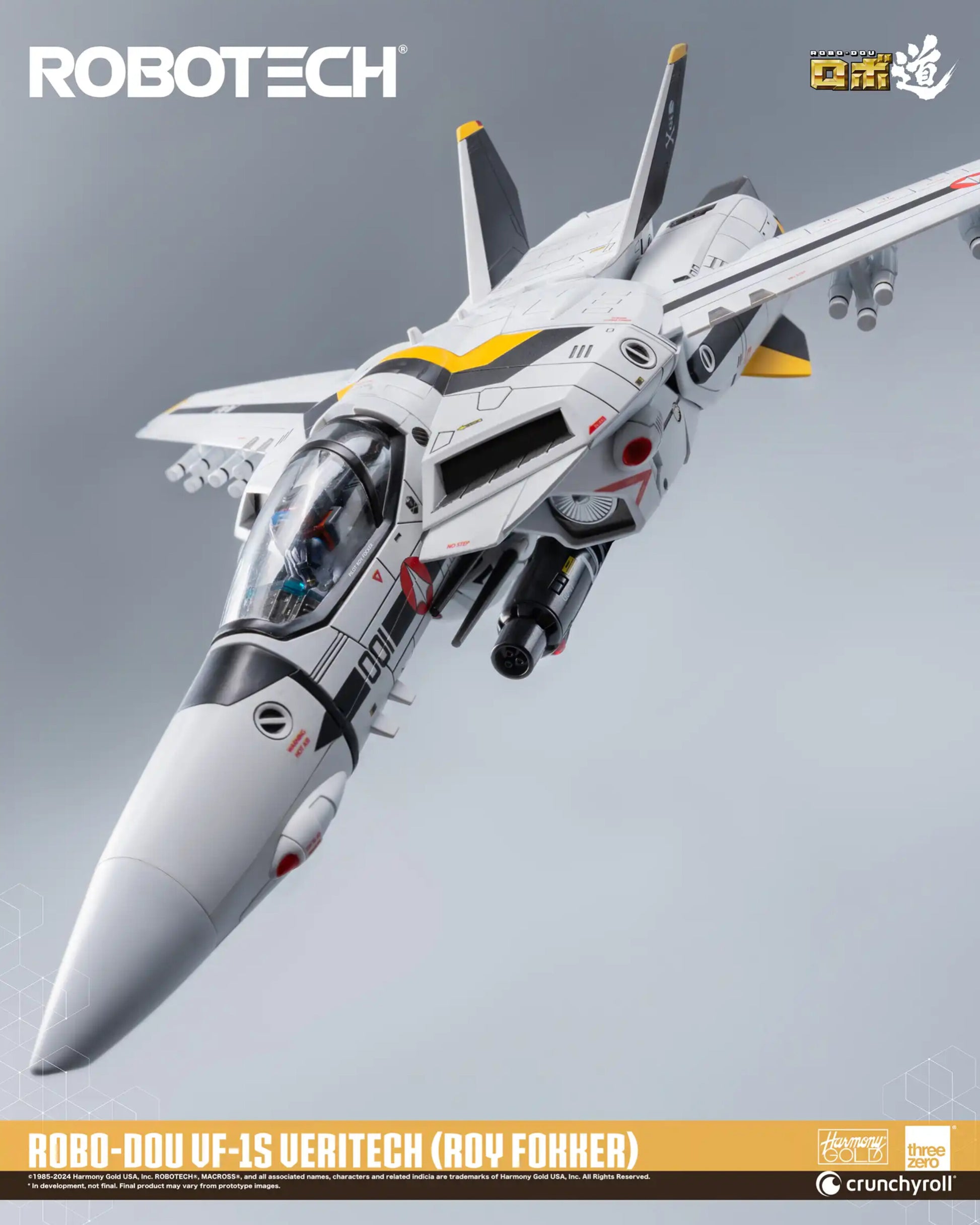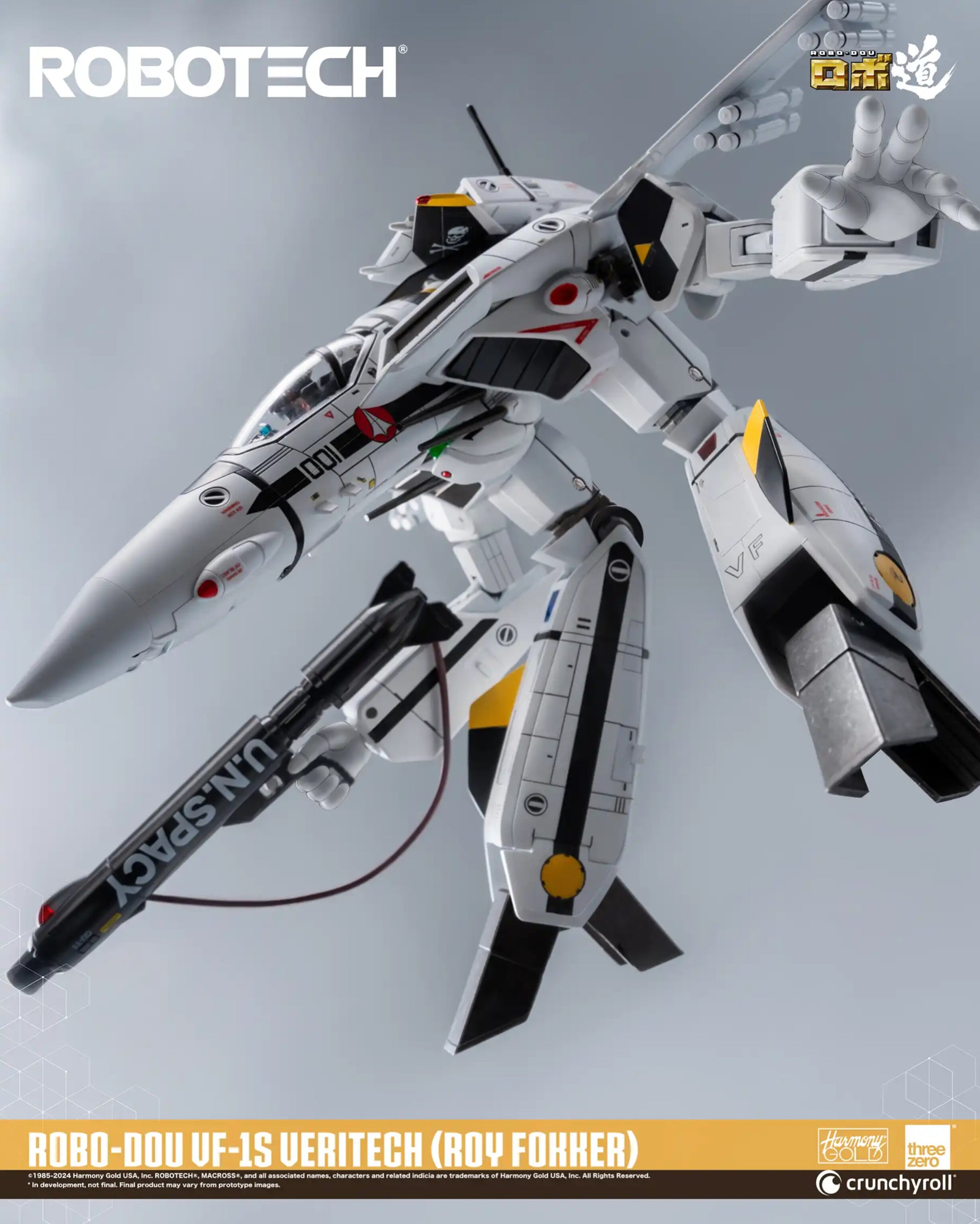 ROBO-DOU ROBOTECH VF‐1S Veritech (Roy Fokker) is a high-fidelity collectible figure designed to capture the appearance as seen in the original anime television series with an extremely high attention to detail. ROBO-DOU Robotech figures are presented with the same ultra-rigid framework that threezero is known for, ensuring structural integrity, a stable posing experience, and signature paint application.
